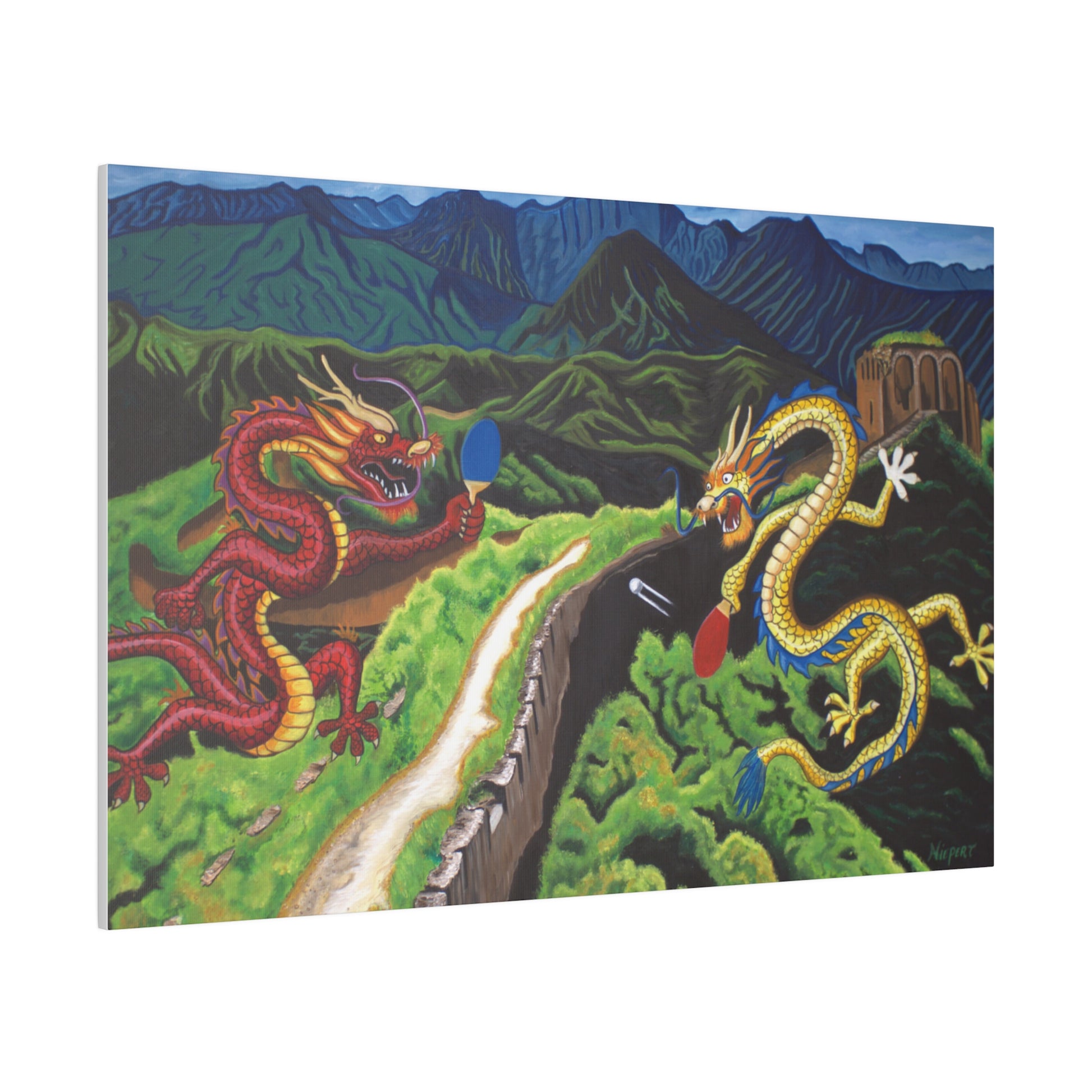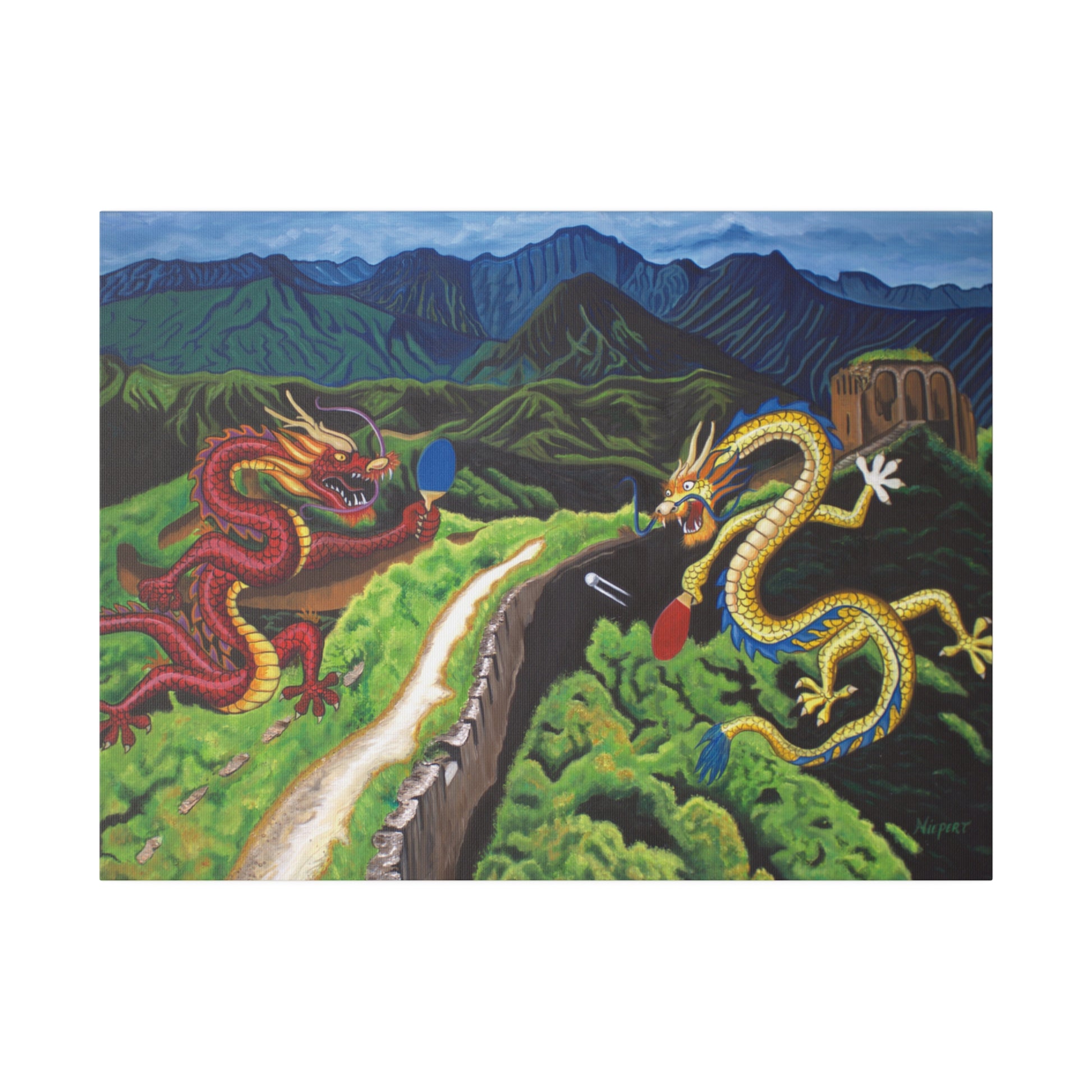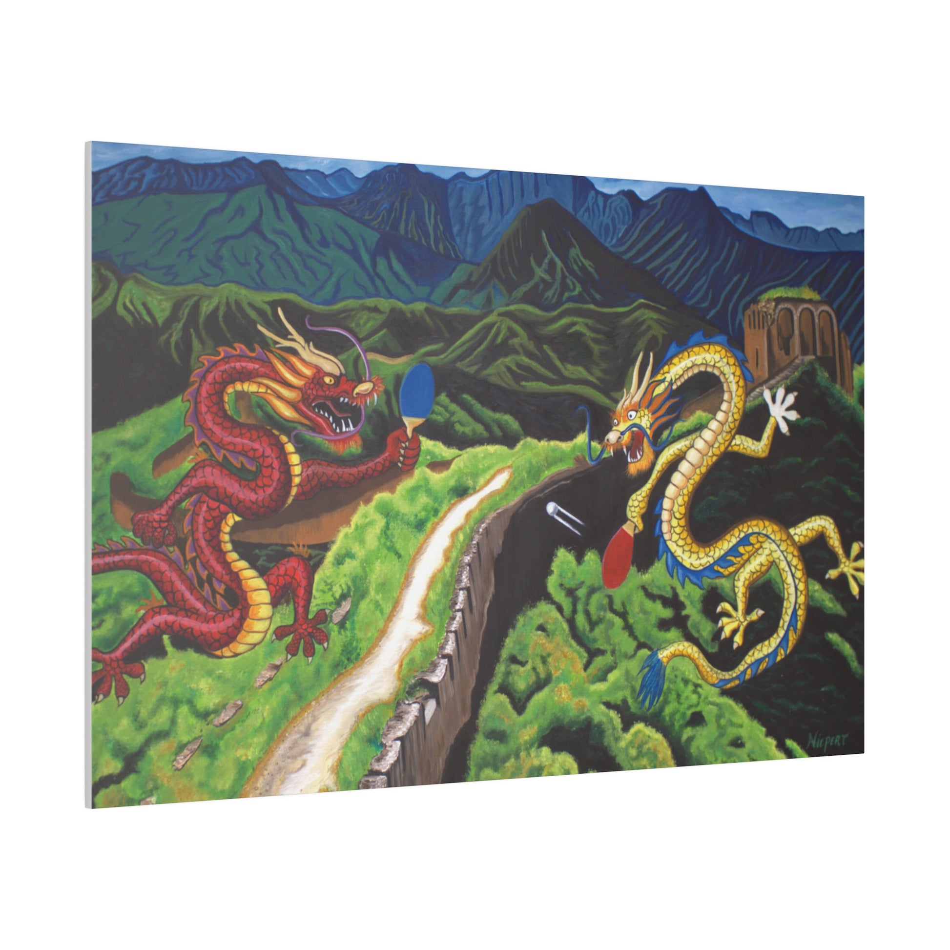 Two dragons having a ping pong match over the Great Wall of China. A fun pinting for any room.
