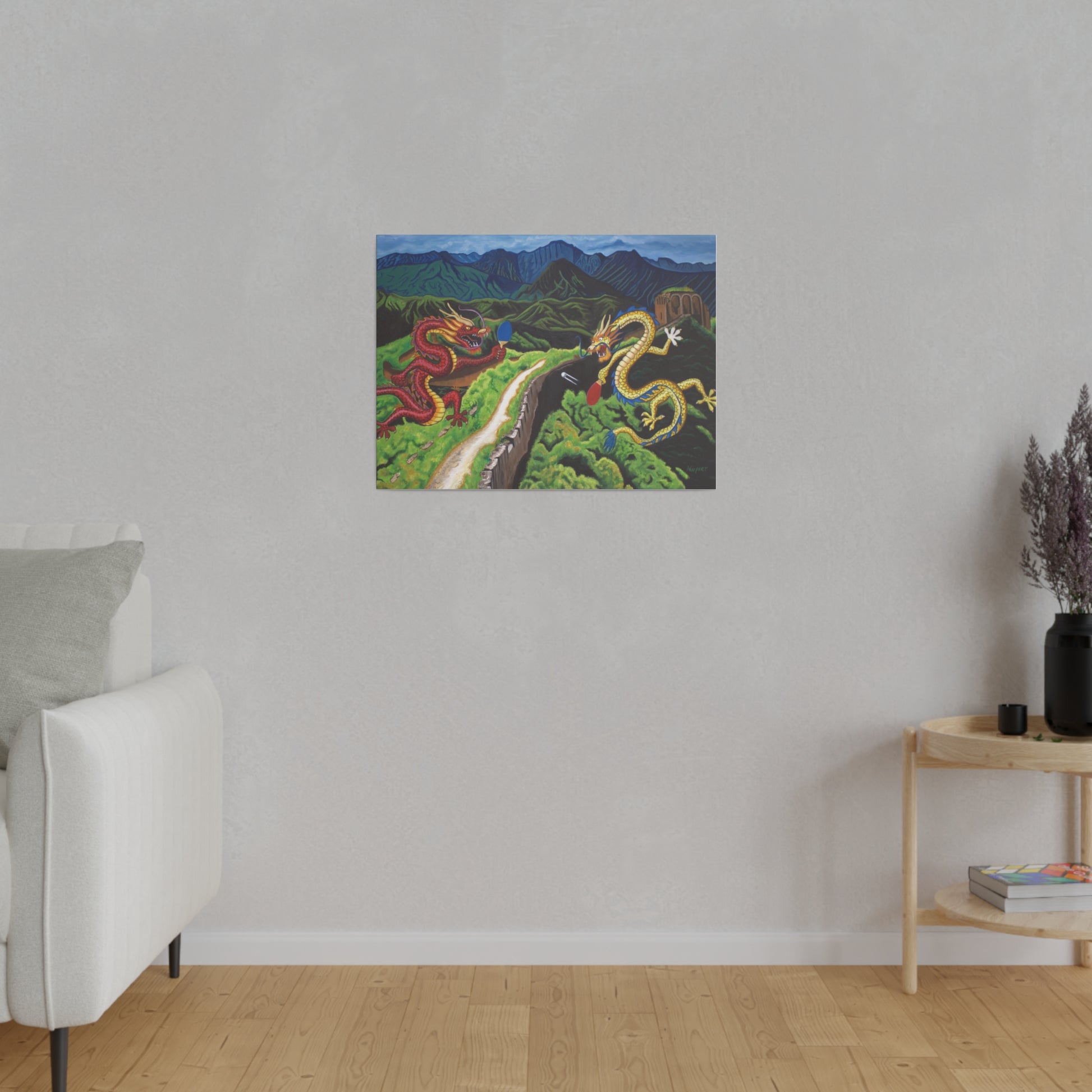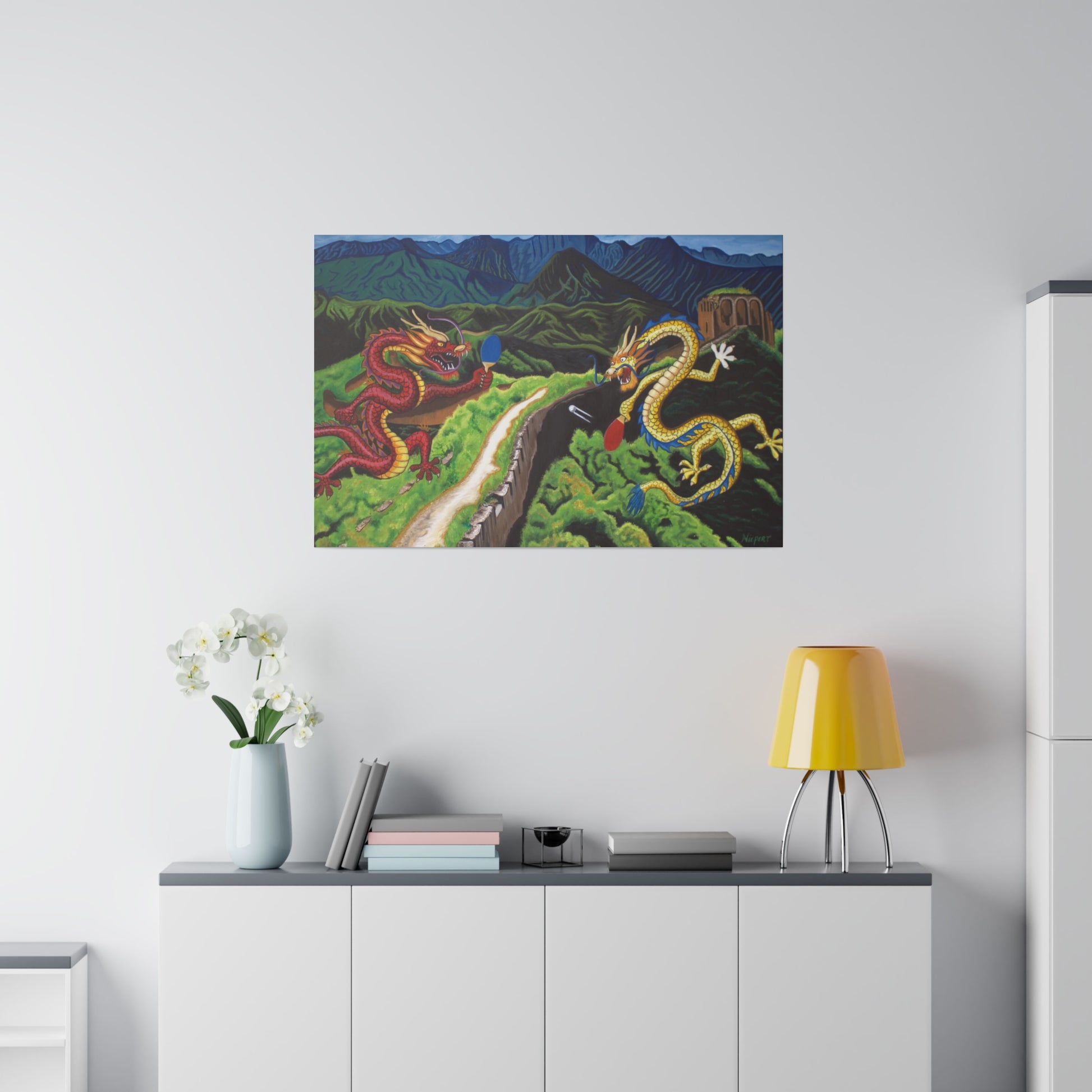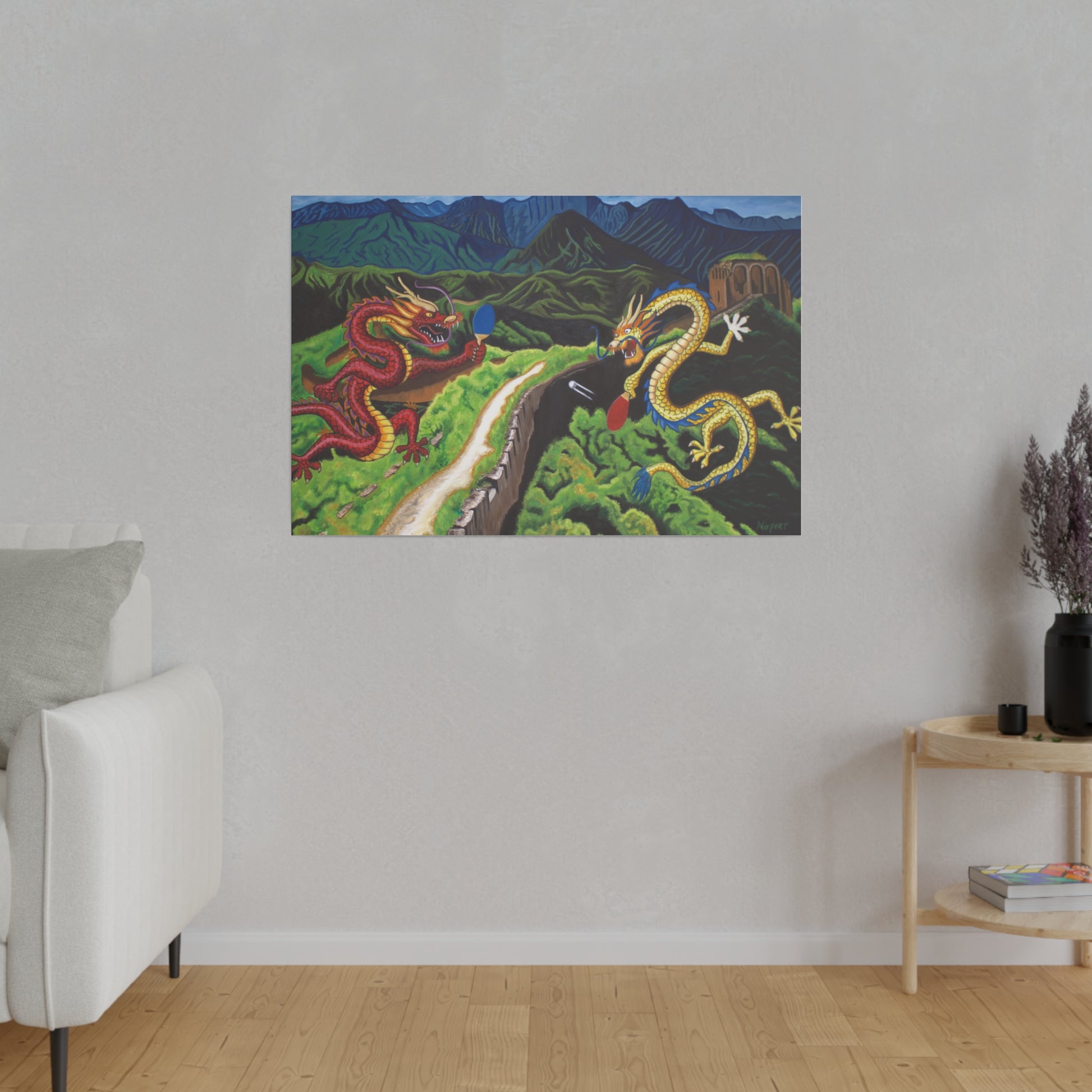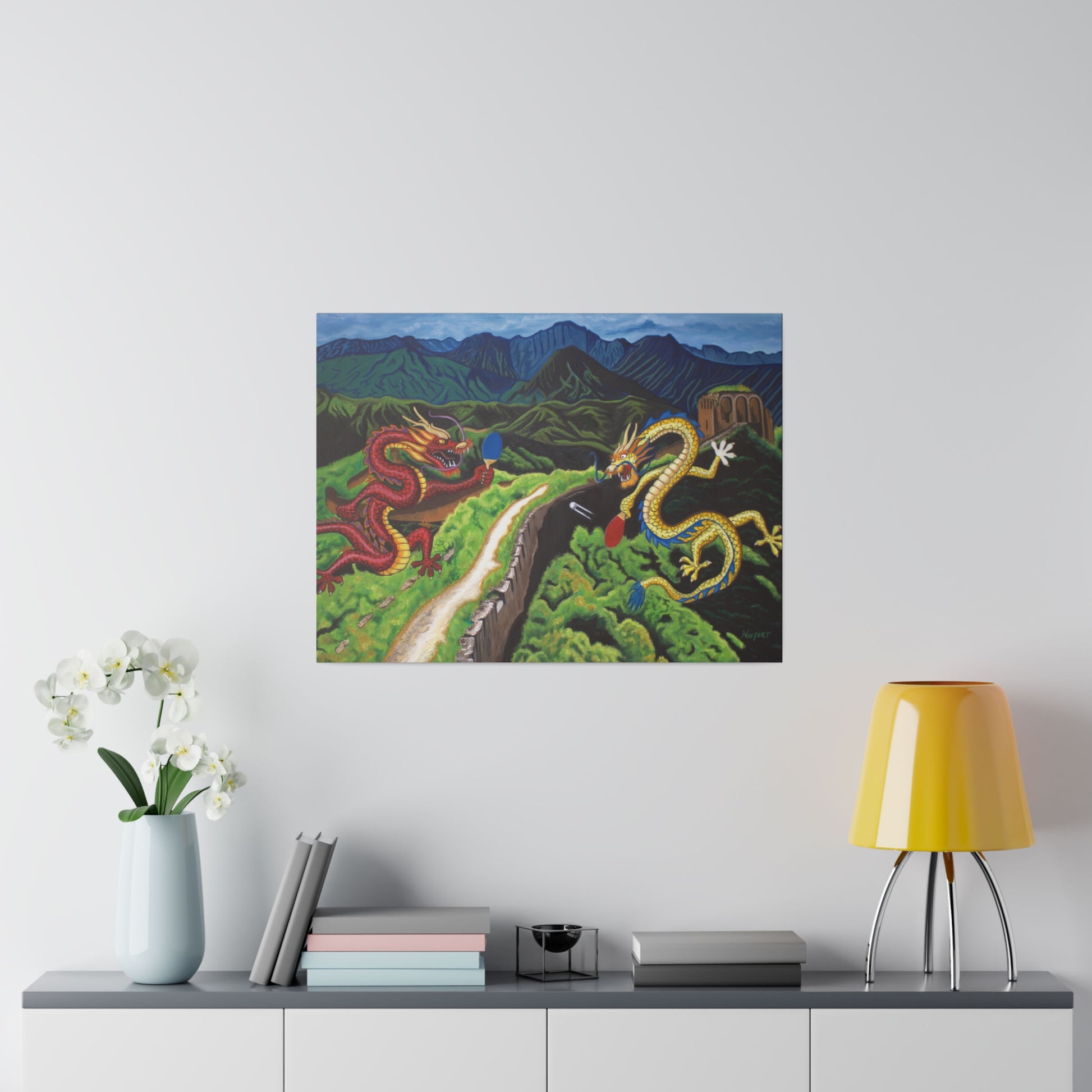 Two dragons having a ping pong match over the Great Wall of China. A fun pinting for any room.