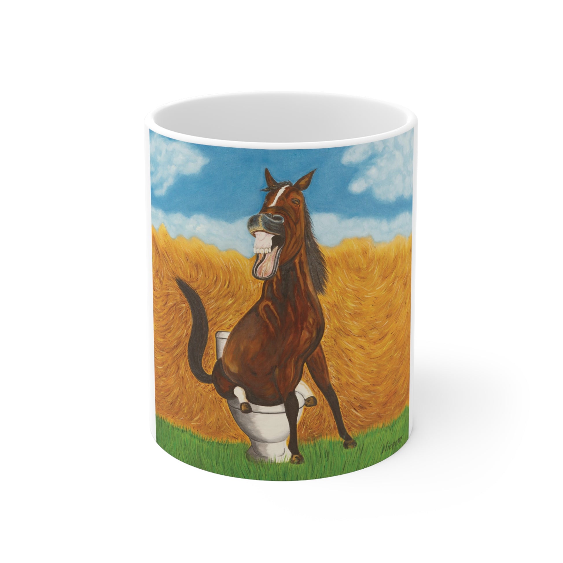 A happy horse is pleased with himself as he takes a dump in a toilet just like a human.