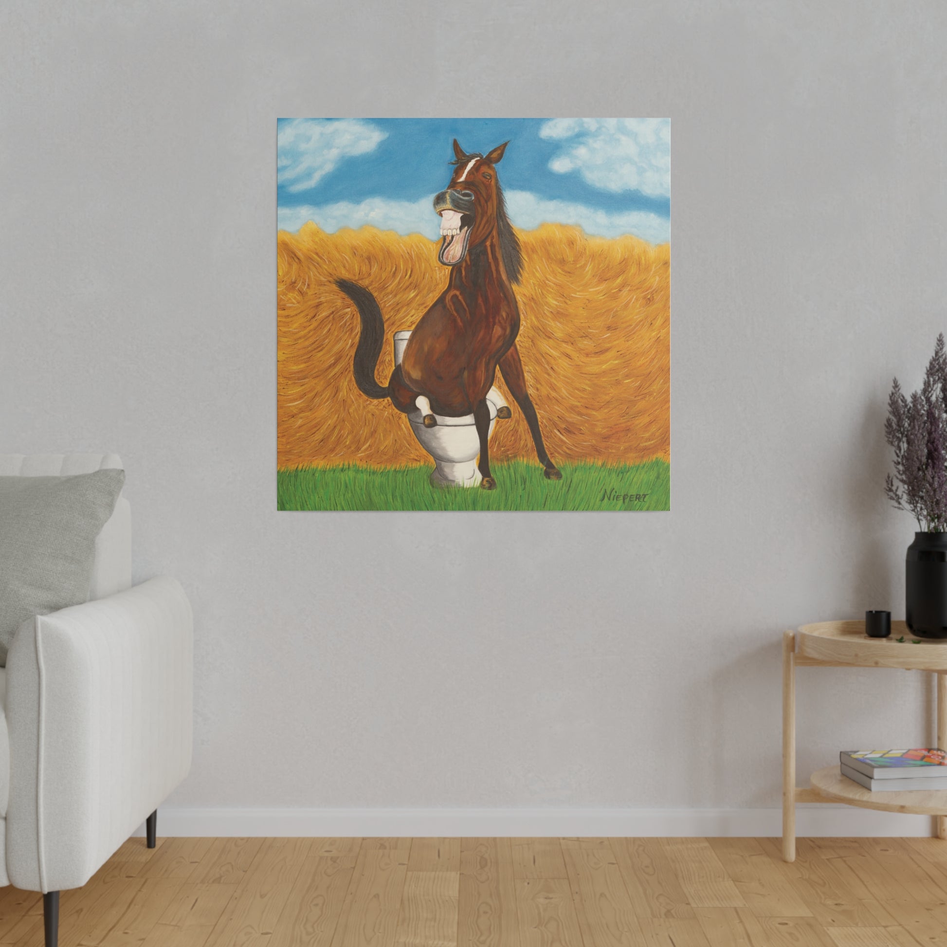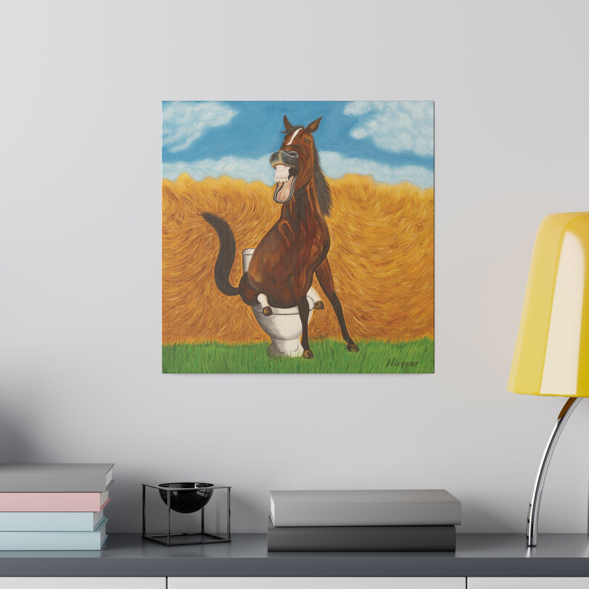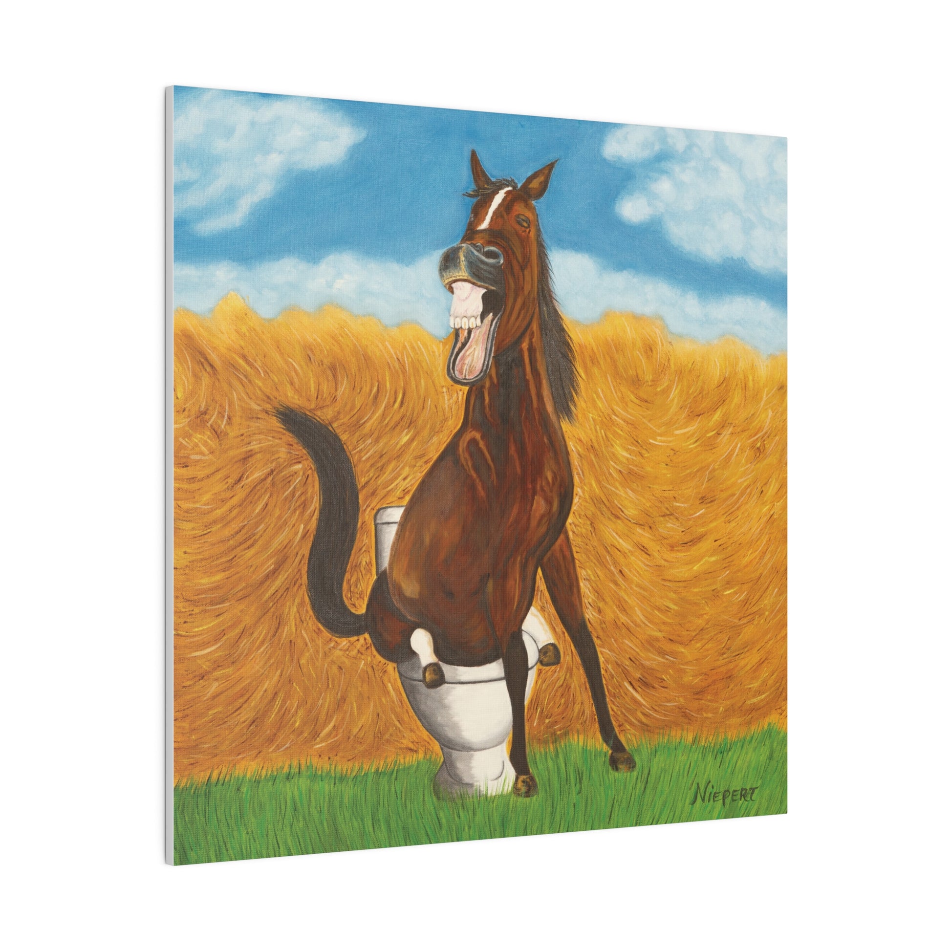 A happy horse is pleased with himself as he takes a dump in a toilet just like a human. Perfect restroom humor.