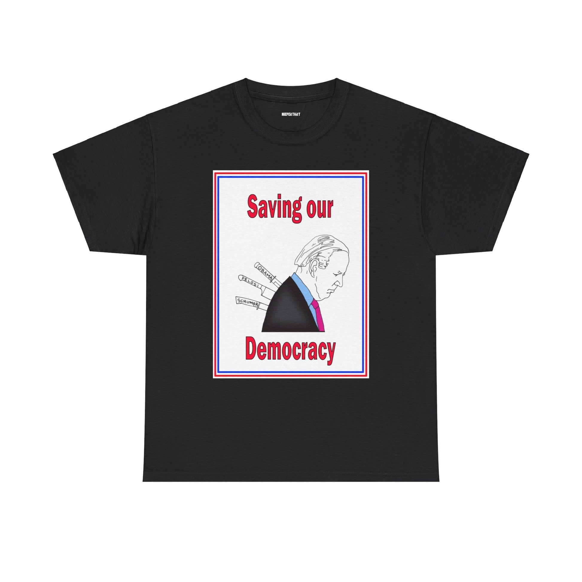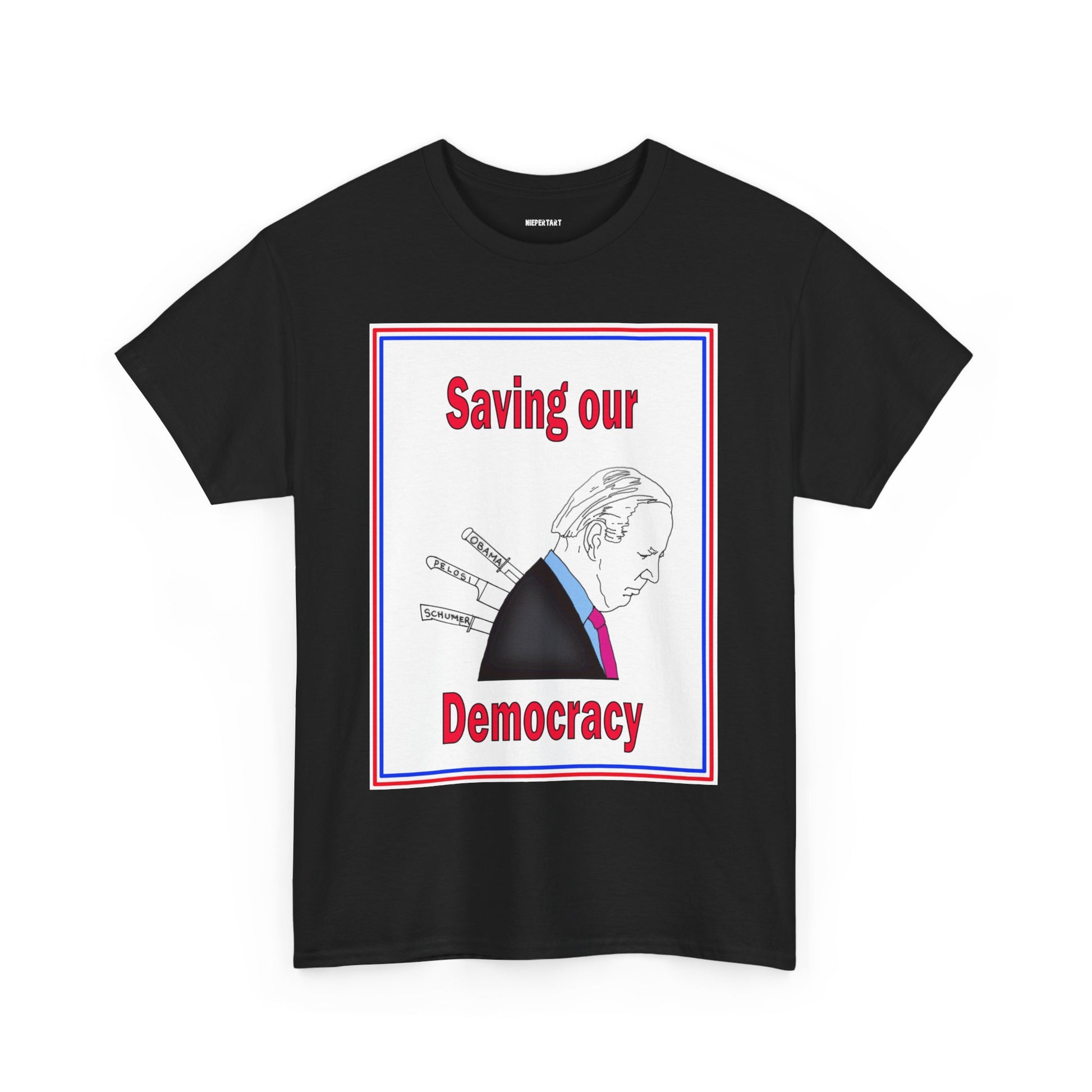 Saving our Democracy" t-shirt. A political satire t-shirt depicting, President Joe Biden, being betrayed by his closet Democratic colleagues. Get laughs from your conservative friends with this funny t-shirt.