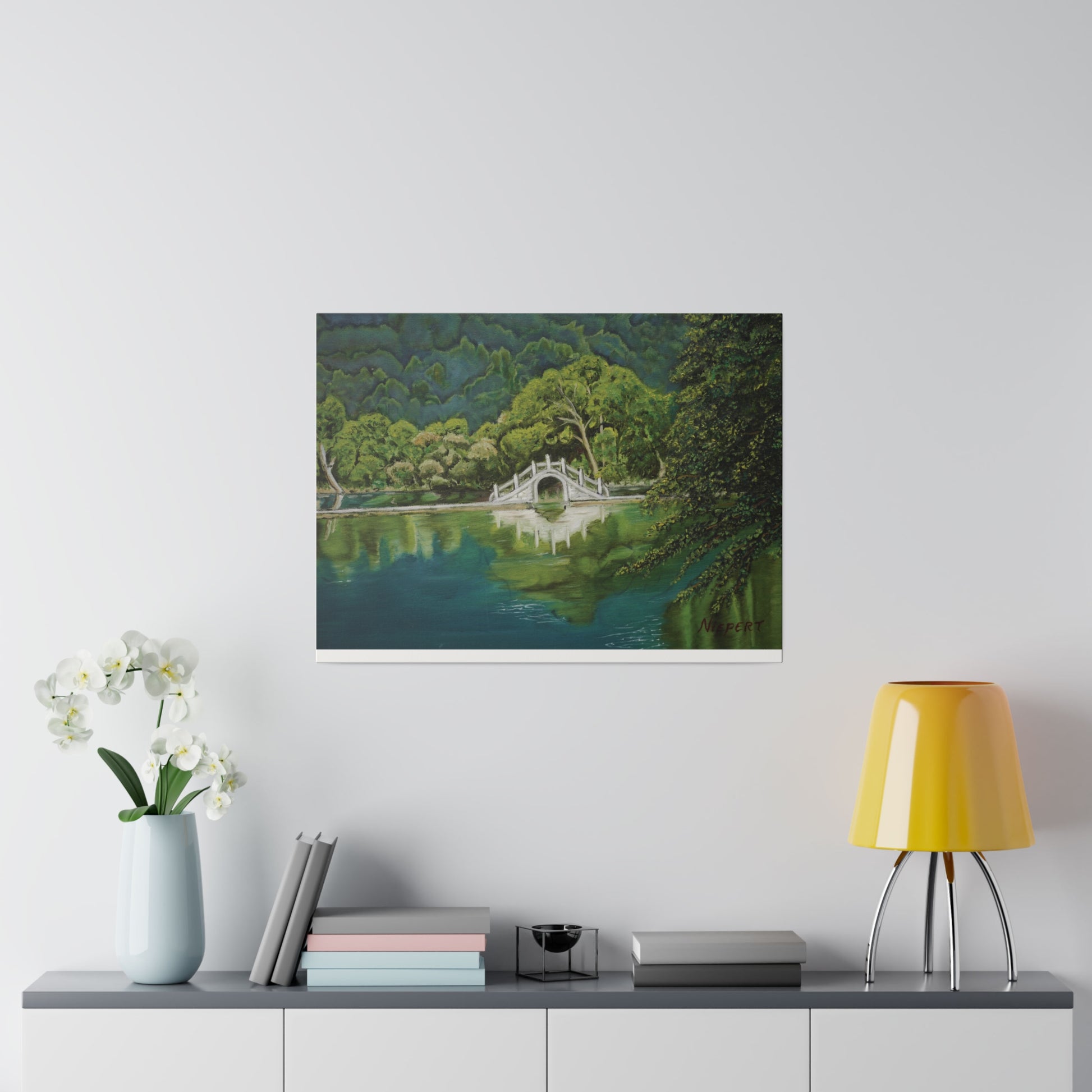 A small stone bridge in on a peaceful lake in central China. A fine addition to any room.