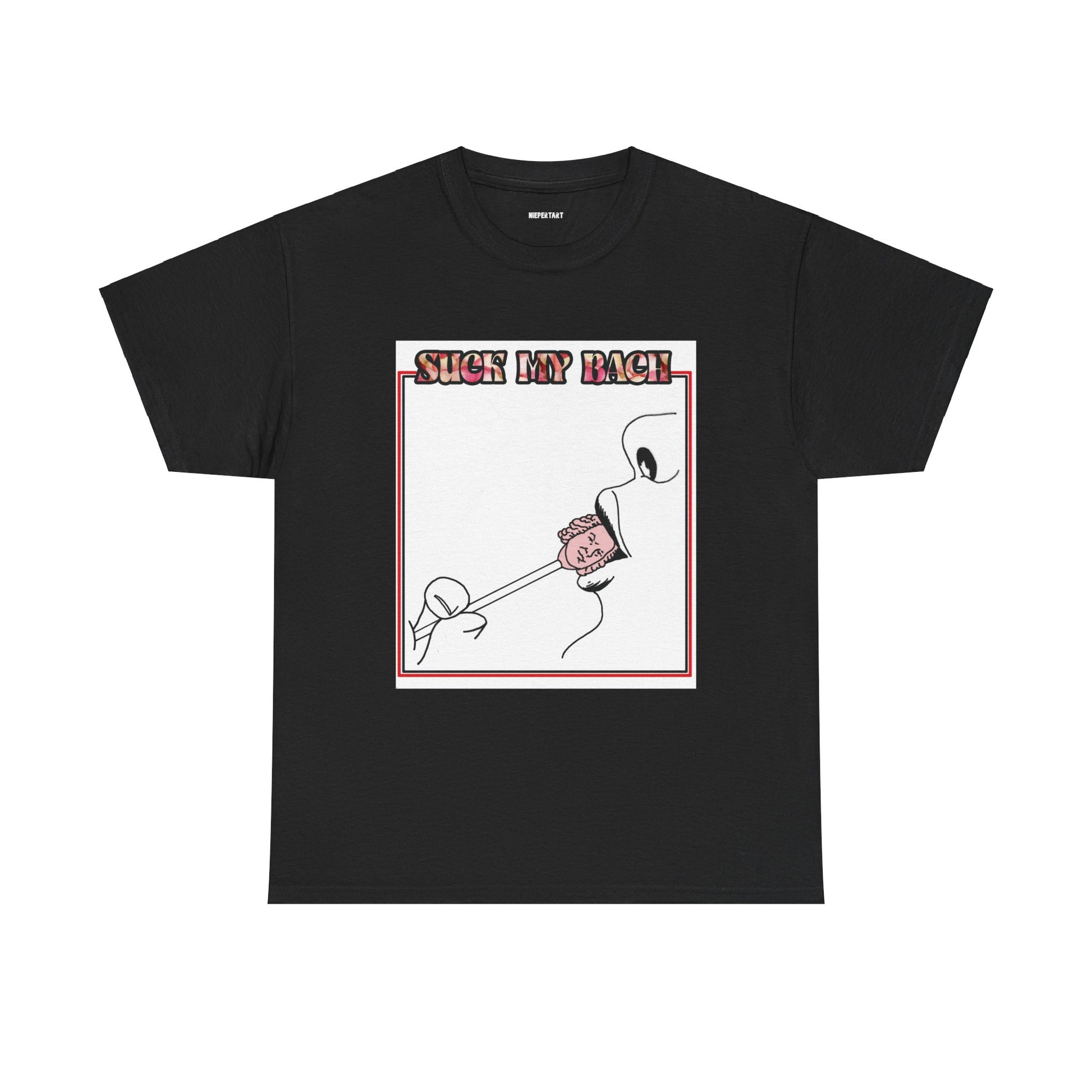 "Suck my Bach 1" t-shirt. A comical shirt that features the composer, Johann Sebation Bach's face on a lollipop and a person sucking on his head. Certainly will crack up your classical music friends. Adult humor!