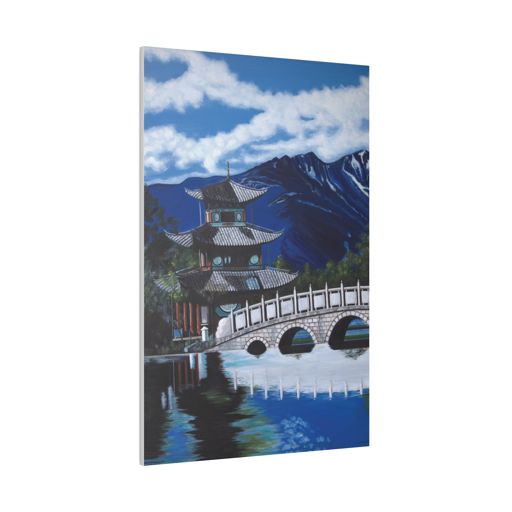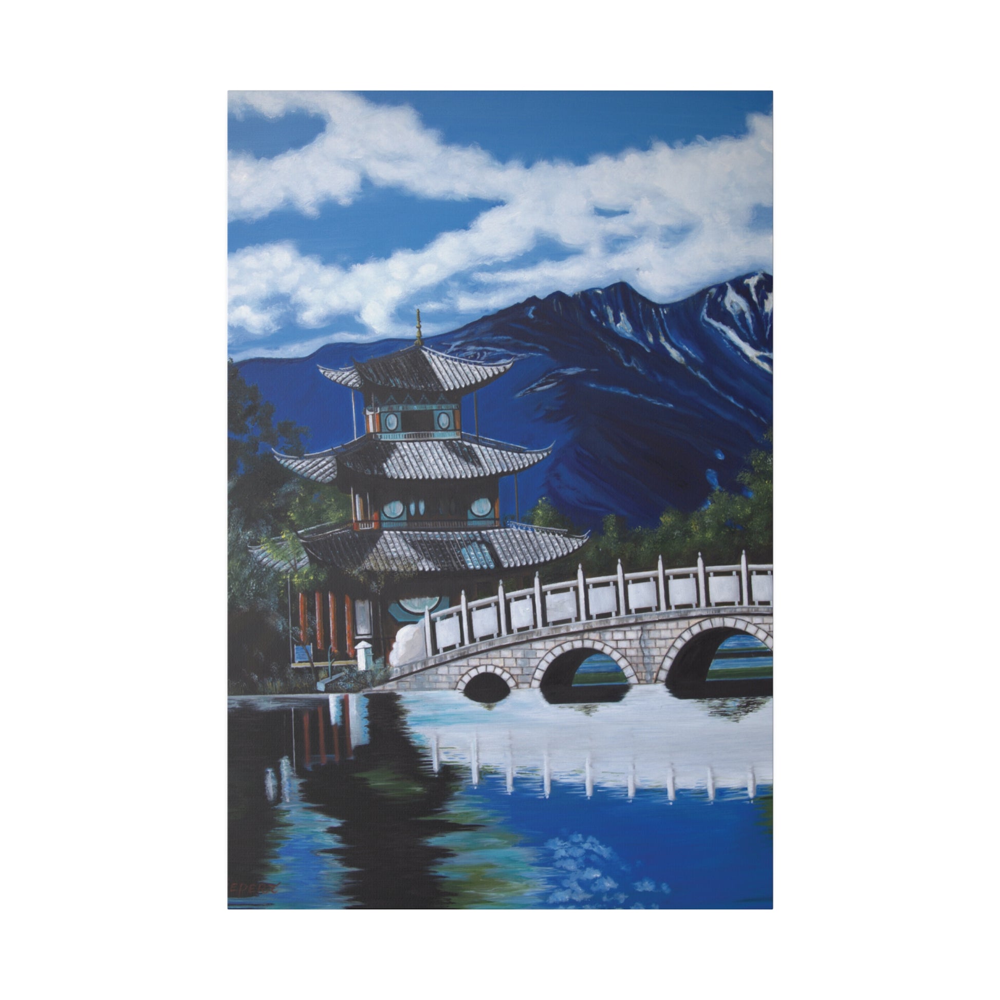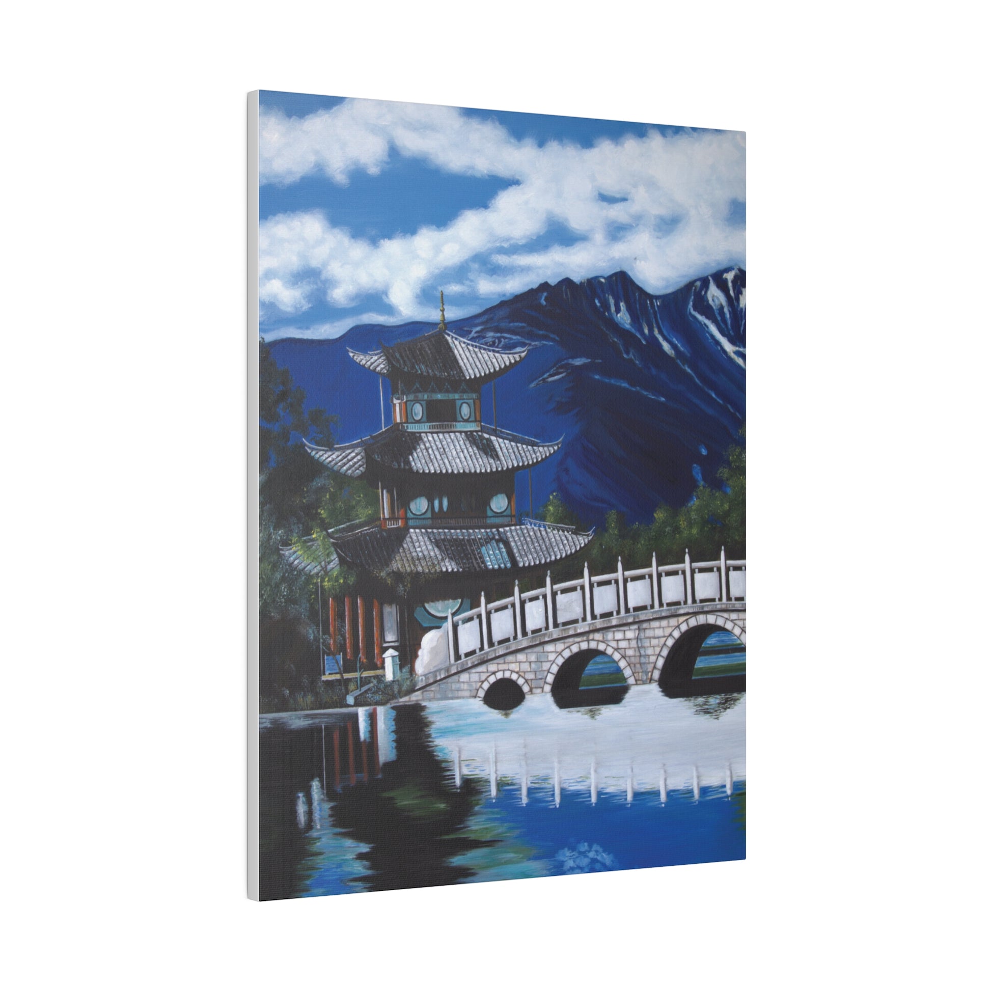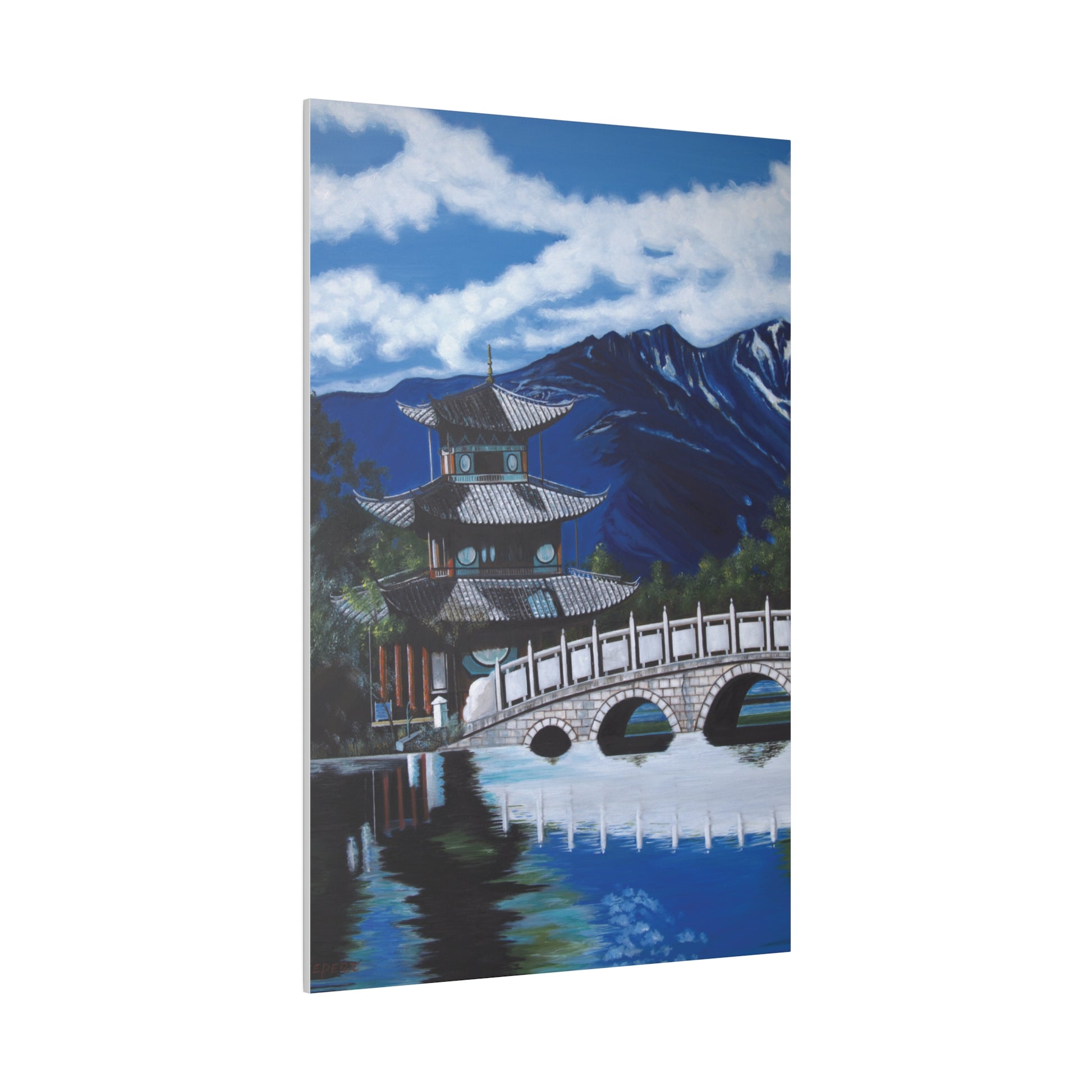 The serene temple on a mountain lake in southern China. A perfect artwork for your own place of meditation. The original artwork took many years to complete.