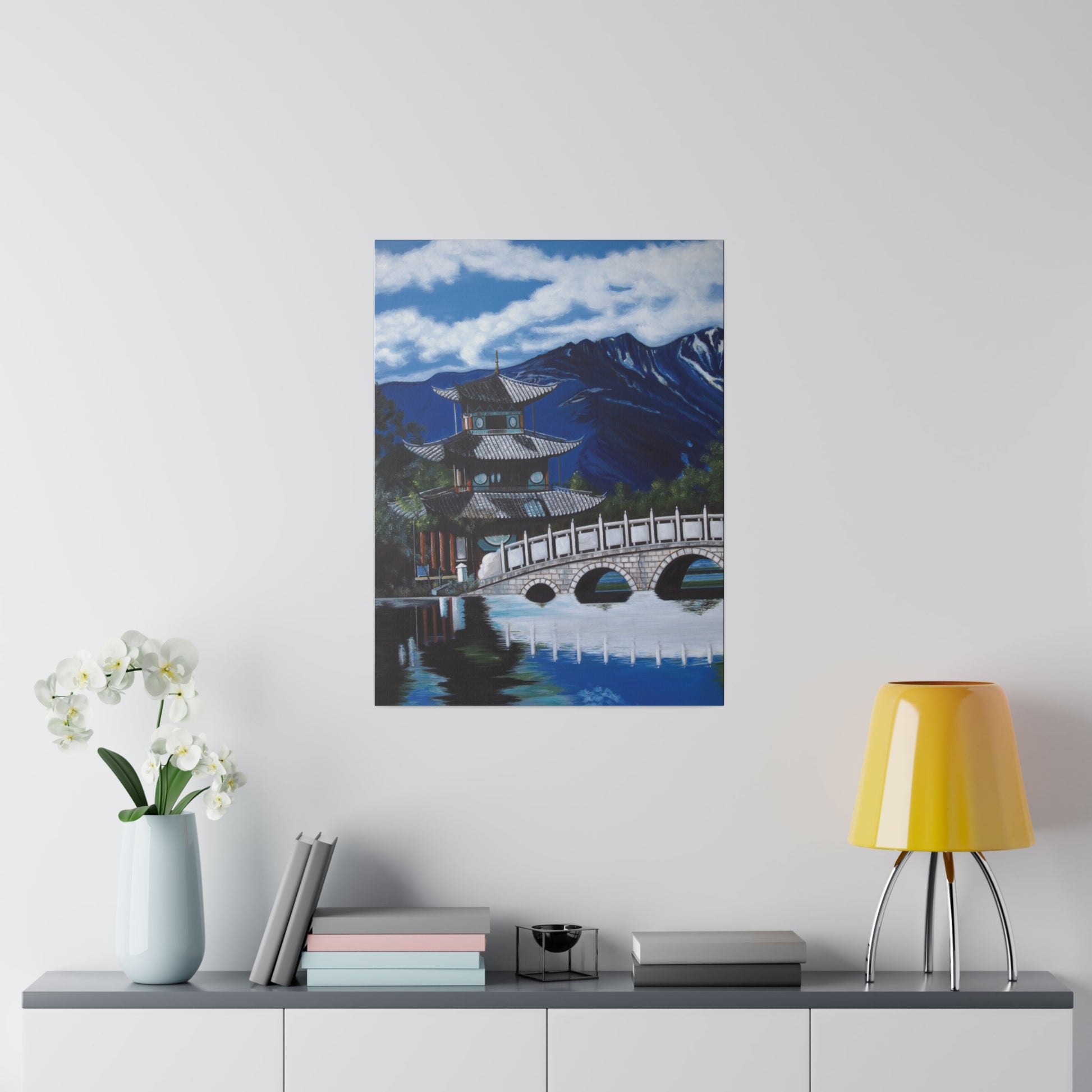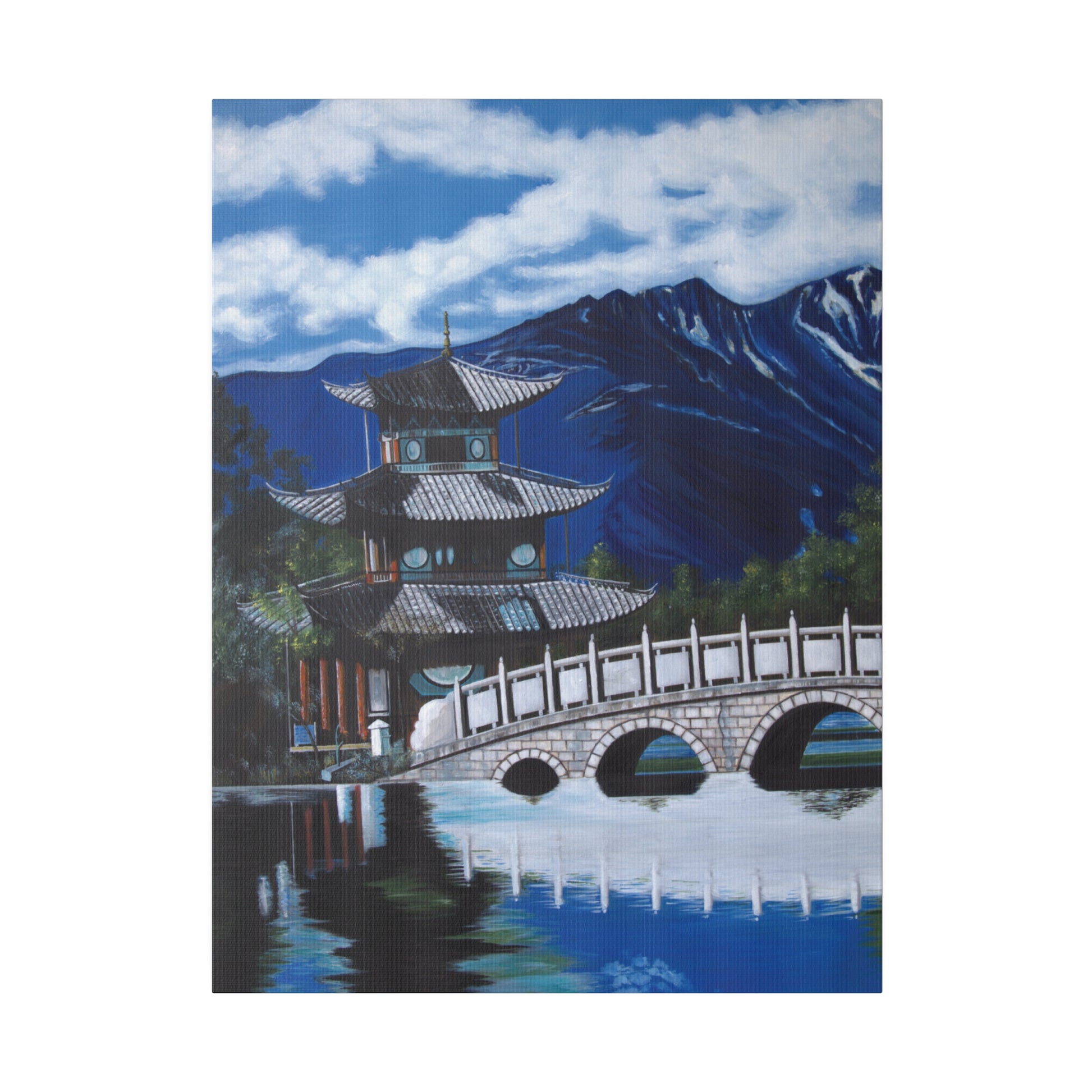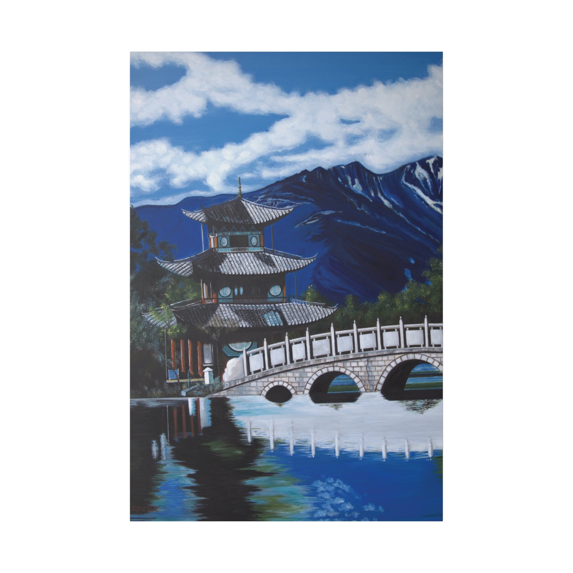 The serene temple on a mountain lake in southern China. A perfect artwork for your own place of meditation. The original artwork took many years to complete.