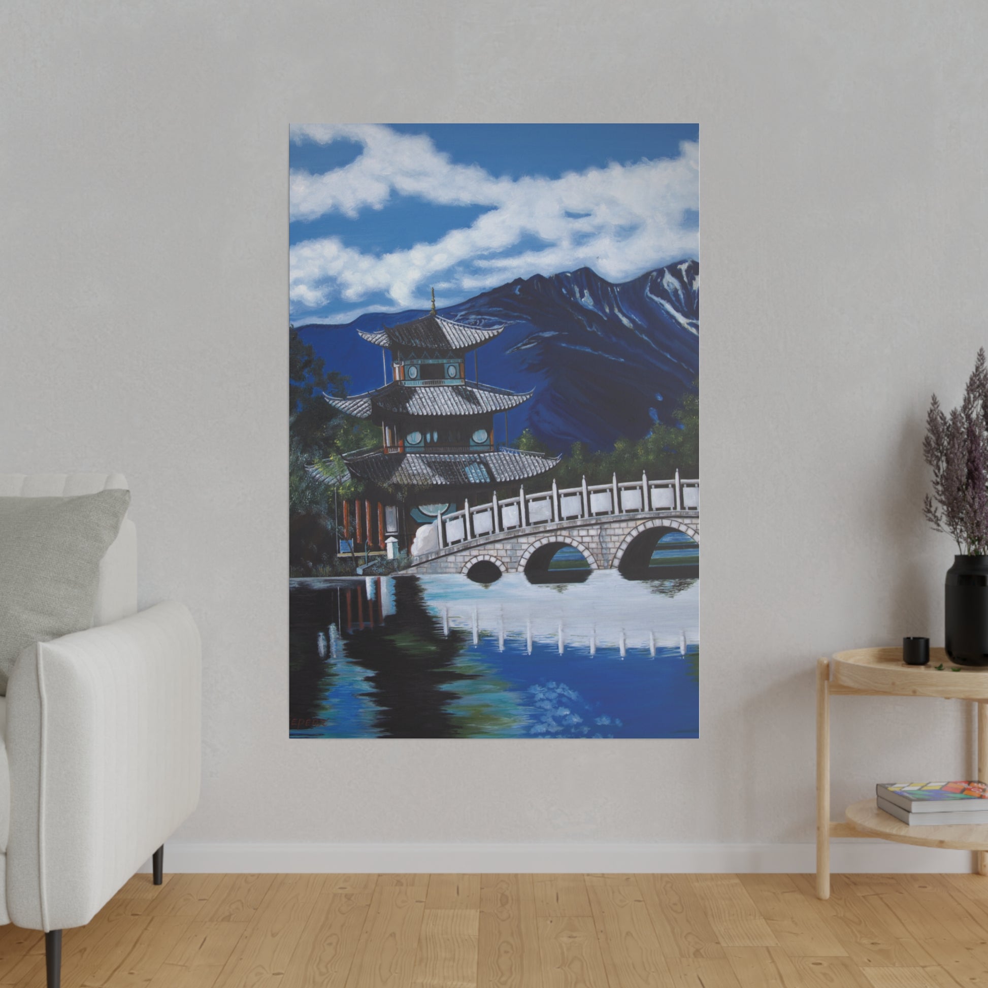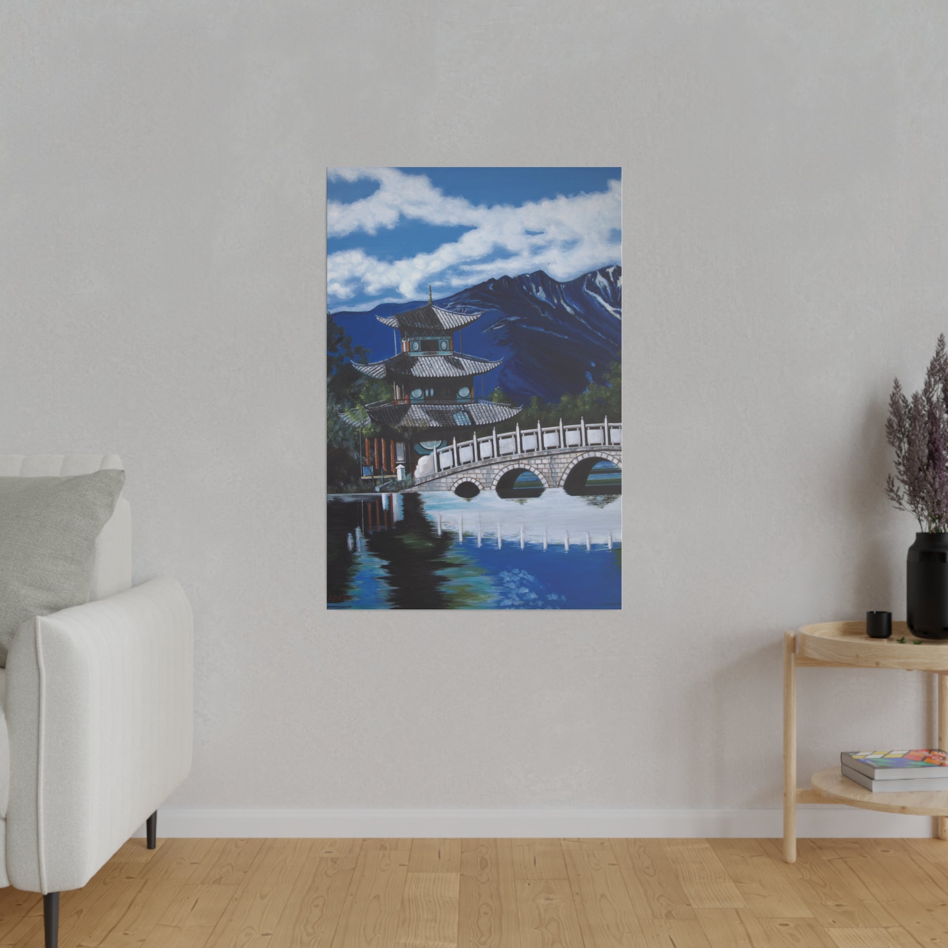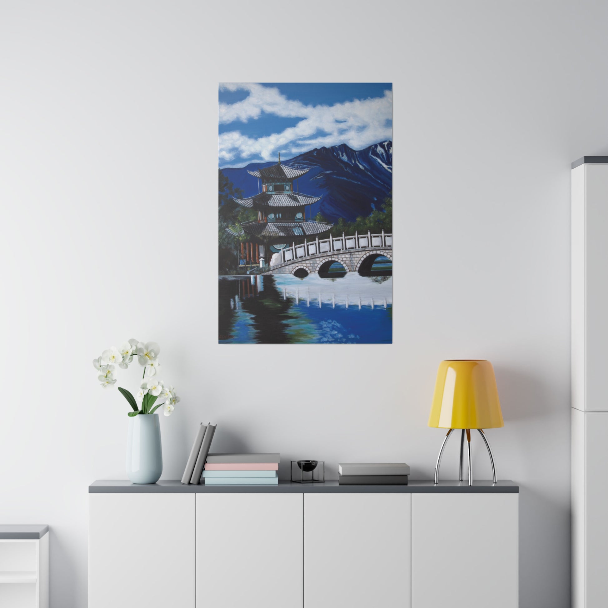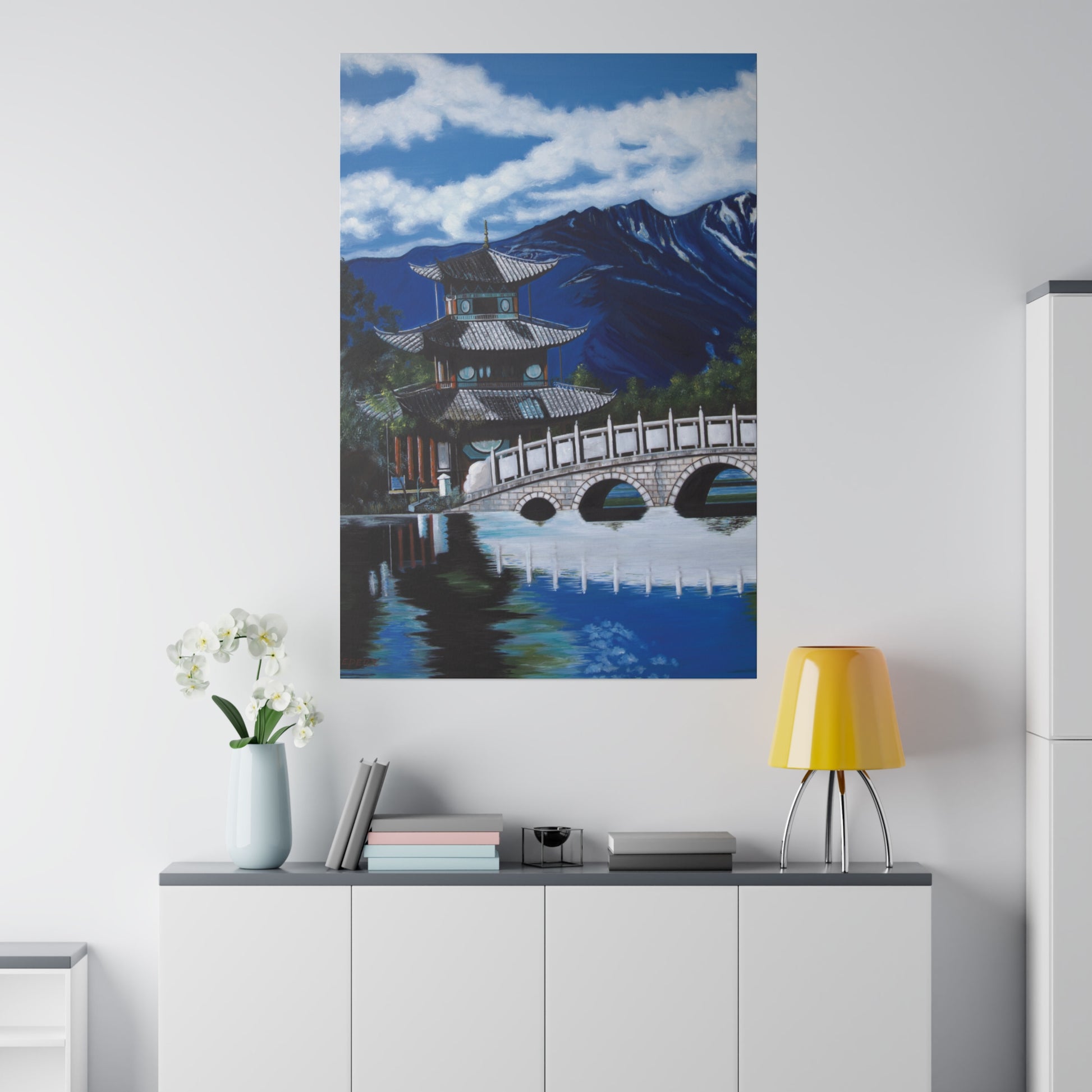 The serene temple on a mountain lake in southern China. A perfect artwork for your own place of meditation. The original artwork took many years to complete.